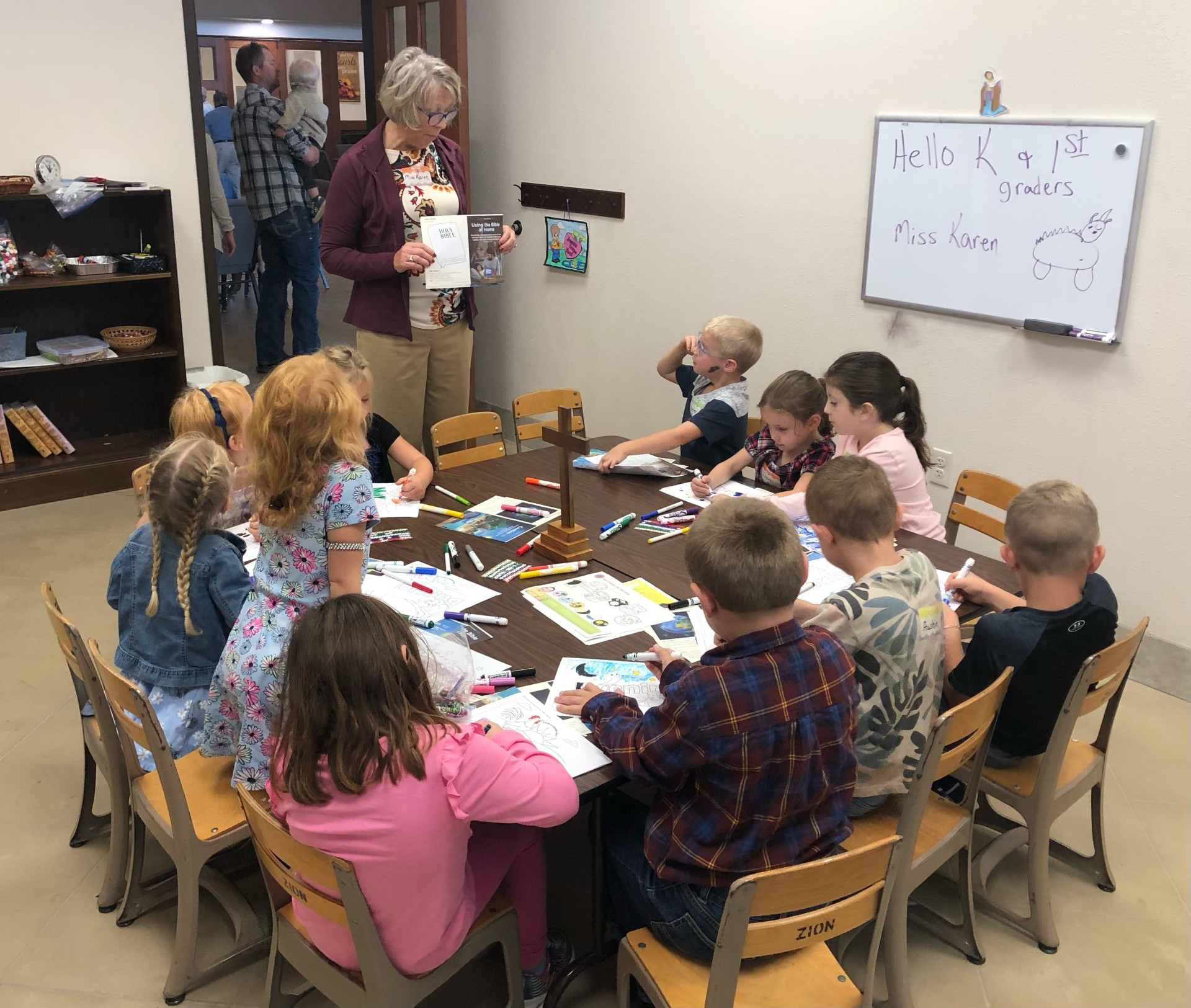 Above: Karen Pederson teaching Sunday School at her home church, Zion Free Lutheran, Tioga, ND.